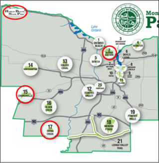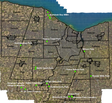 The District has partnered with Monroe County Parks Department, Tinker Nature Park (Town of Henrietta), Oatka Creek Watershed Committee, Genesee Country Village & Museum, Rush Recreation & Park Association, Village of Honeoye Falls, Braddock Bay Wildlife Management Area (NYS Department of Environmental Conservation), and Town of Wheatland to plant over 11,000 trees across 17 different sites (6 county parks, 5 municipal parks, 3 state wildlife management areas, 1 parcel owned by the museum) totaling ~200 acres of reforestation.